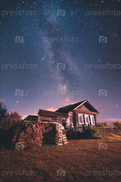 Домик в деревне летней ночью под великолепным звездным небом