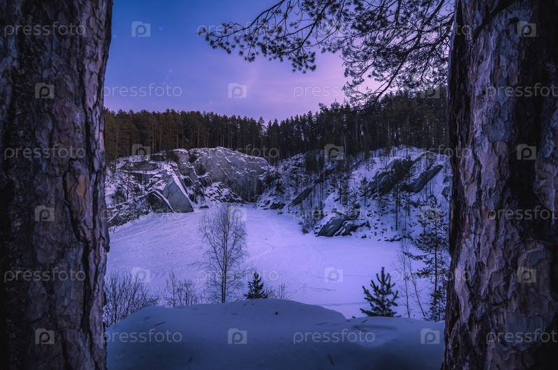 Замерзшее горное озеро под снегом и льдом среди скал в сумерки