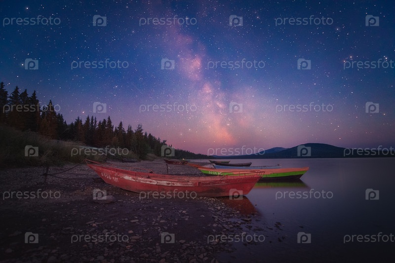 Красивое звездное небо и Млечный Путь над пришвартованными к берегу горного озера лодками