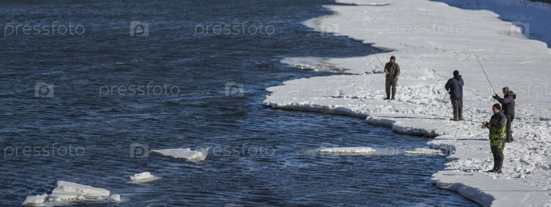 Рыбаки с удочками на краю льдины рядом с голубой водой