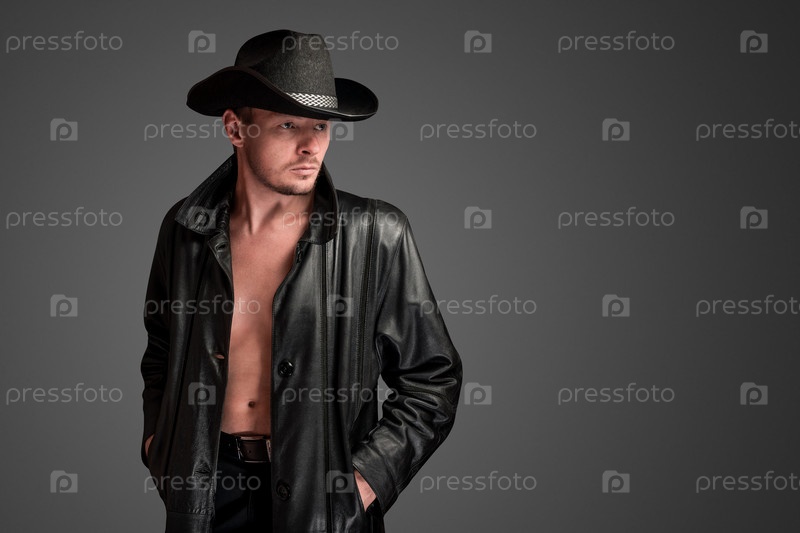Ковбой в кожаной куртке смотрит в сторону на свое обнаженное тело