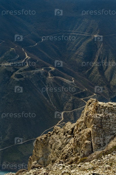 Россия. Северо-Восточный Кавказ. Республика Дагестан. Головокружительный панорамный вид на горные серпантины на склонах Сулакского каньона с крутых скал села Дубки