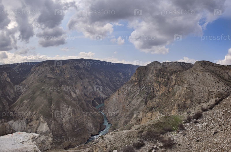 Россия. Северо-Восточный Кавказ. Республика Дагестан. Головокружительный панорамный вид на горные серпантины на склонах Сулакского каньона с крутых скал села Дубки