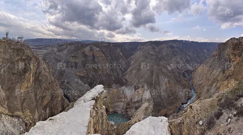 Россия. Северо-Восточный Кавказ. Республика Дагестан. Головокружительный панорамный вид на горные серпантины на склонах Сулакского каньона с крутых скал села Дубки