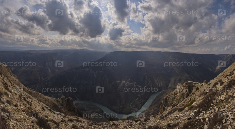 Россия. Северо-Восточный Кавказ. Республика Дагестан. Головокружительный панорамный вид на горные серпантины на склонах Сулакского каньона с крутых скал села Дубки