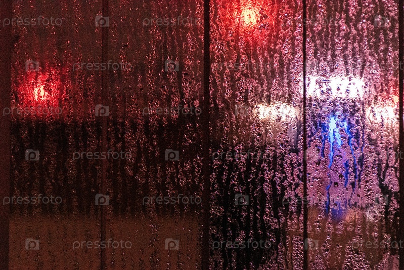 Свет сквозь капли дождя на стекле, абстрактный фон городской улицы в боке