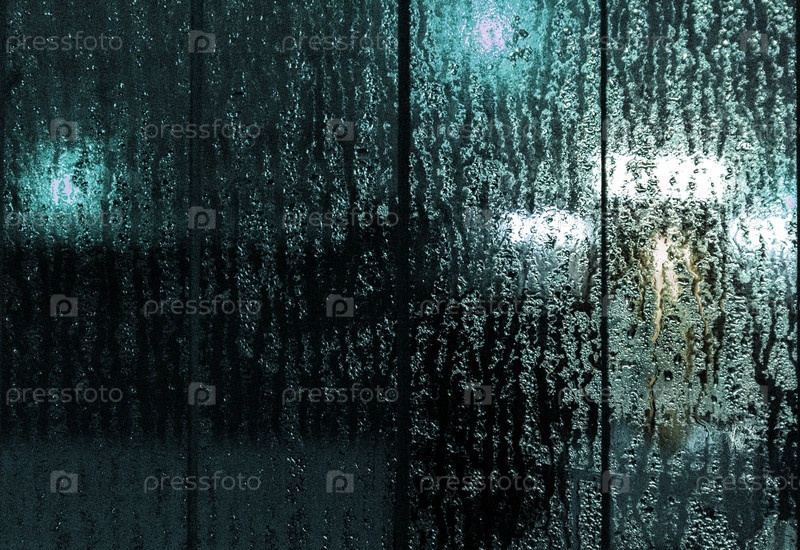 Свет сквозь капли дождя на стекле, абстрактный фон городской улицы в боке