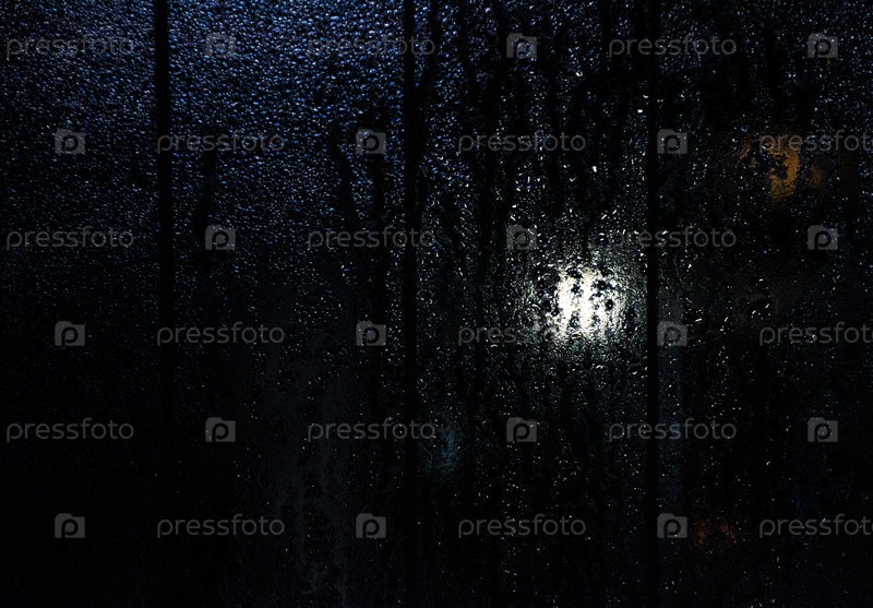 Свет сквозь капли дождя на оконном стекле, абстрактный фон ночного города в боке