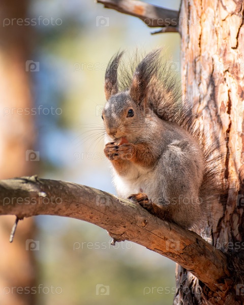 Белка в зимней шубе сидит на ветке сосны и грызет орех