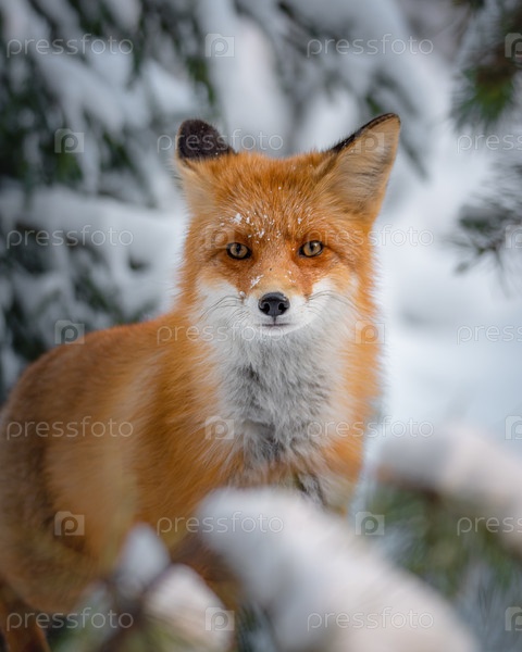 Рыжая лисица в лесу среди покрытых снегом хвойных деревьев смотрит прямо в камеру