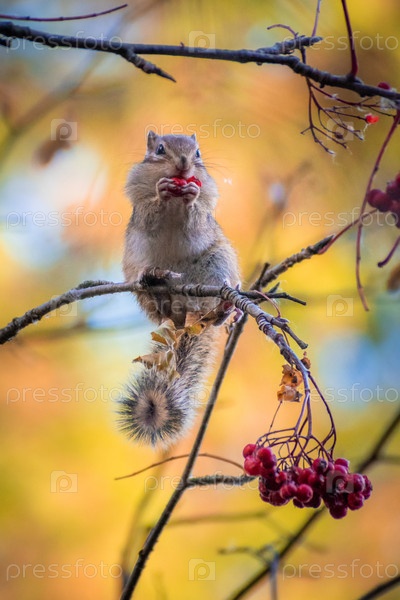 Бурундук в осеннем лесу сидя на ветках рябины собирает ягоды