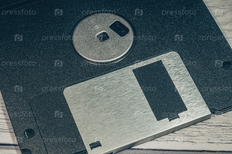 Старая дискета крупным планом. В кадре часть дискеты. Основное внимание уделяется алюминиевой задвижке
