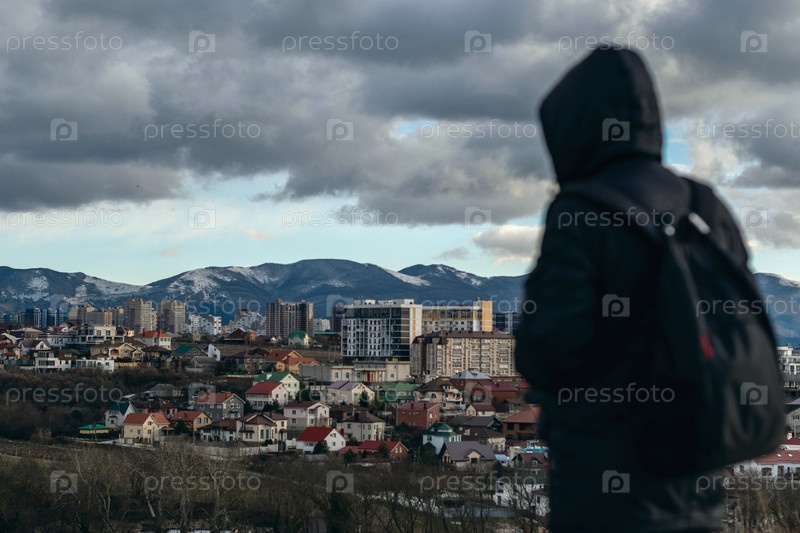 Путешественник на вершине горы смотрит вдаль, перед ним открывается красивый пейзаж гор и города, горный туризм и активный здоровый образ жизни, приключенческий отдых