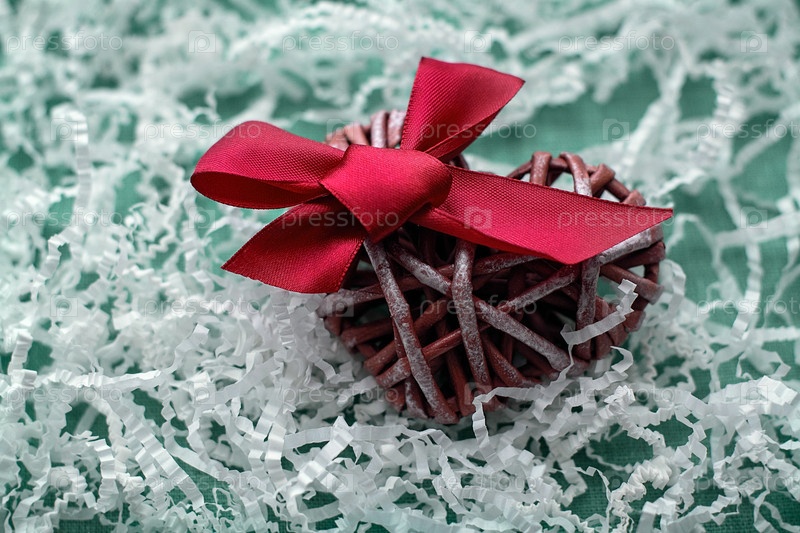 Форма сердца ручной работы с ярким алым бантом, концепция подарка для близких, свадьба, день рождения, Международный женский день, 8 марта, День святого Валентина, 14 февраля, День матери