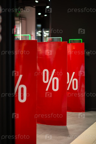Входные ворота со сканером для предотвращения кражи в магазине одежды. Сканеры украшены рекламными плакатами, сообщающими о распродаже со скидкой