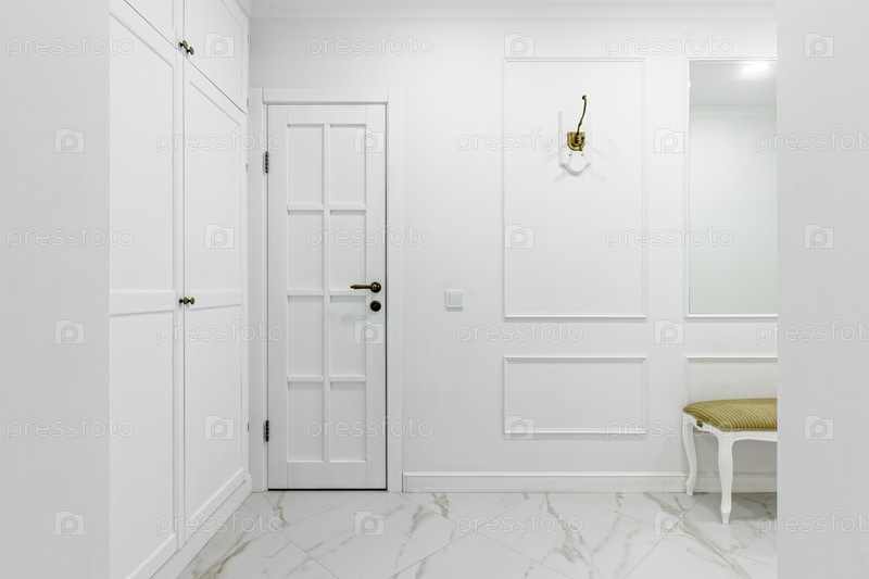 Белый интерьер прихожей с деревянной банкеткой с золотой столешницей