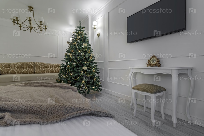 Скандинавский, уютный интерьер гостиной с рождественской елкой, белыми тонами, журнальным столиком и диваном