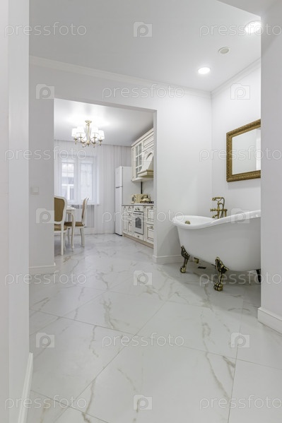 Отдельно стоящая чаша для ванны, расположенная в коридоре квартиры, с золотыми ножками и большим зеркалом на стене