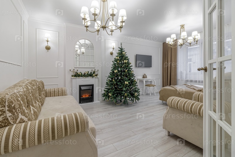 Скандинавский, уютный интерьер гостиной с рождественской елкой, белыми тонами, журнальным столиком и диваном