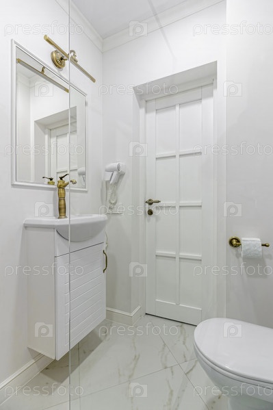 Ванная комната из белого мрамора, золотые смесители и душ