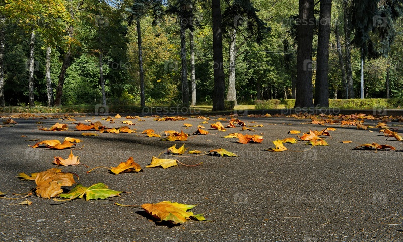 Москва, Россия. Опавшие желто-золотистые кленовые листья на асфальте городского парка на Воробьевых Горах