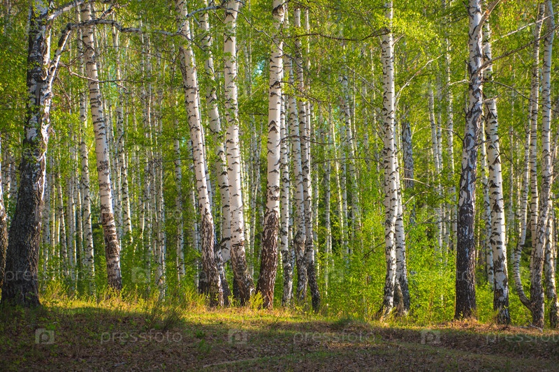 Березовая роща освещенная солнцем на закате весной