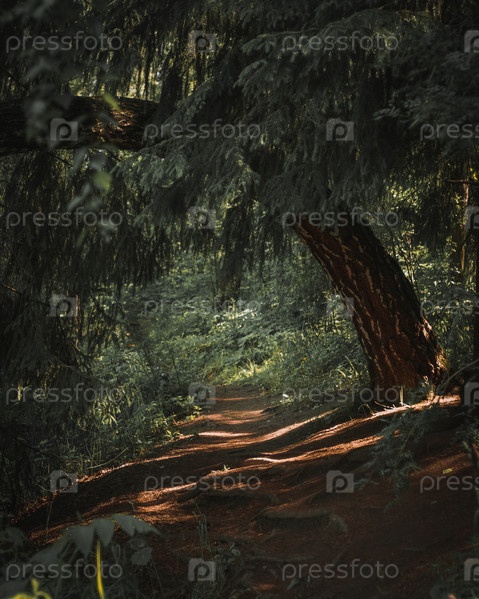 Лесная тропа на закате. Объемные тени, солнечный свет сквозь деревья. Обработка в стиле пленочной фотографии