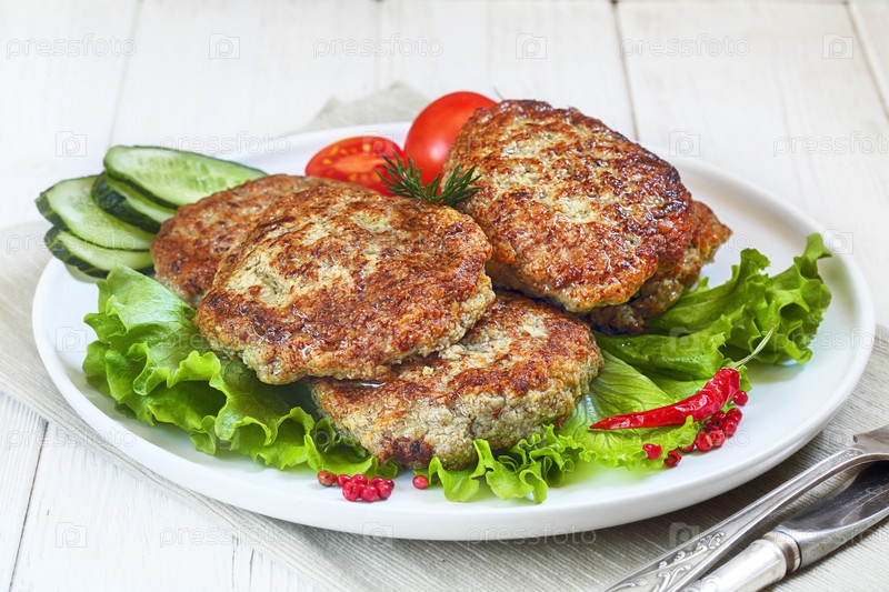 Котлеты на белой тарелке с листовым салатом на деревянном фоне
