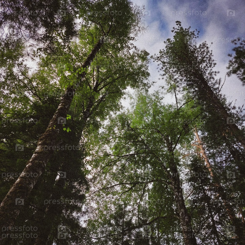 Вид на лес снизу с зелеными деревьями на фоне неба