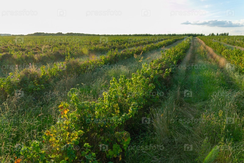 Ряды куста смородины на сельскохозяйственном поле