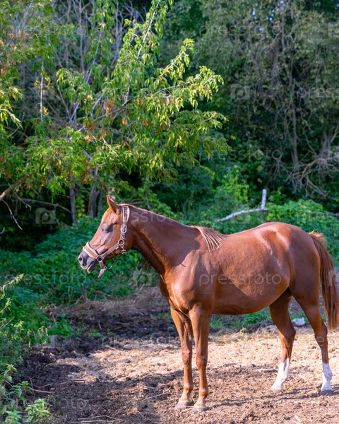 Гнедой жеребец был сфотографирован сбоку