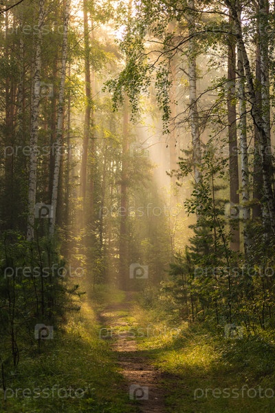 Солнечные лучи пробиваются через туман в утреннем лесу