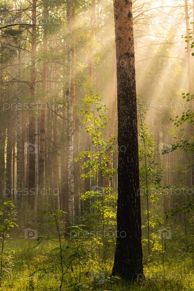 Солнечные лучи пробиваются через туман в утреннем лесу