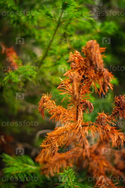 Красивые детали леса. Оранжевые сухие хвойные ветки среди зелени