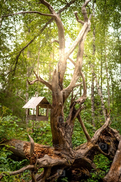 Красивые детали леса. Кормушка висит на корнях поваленного дерева