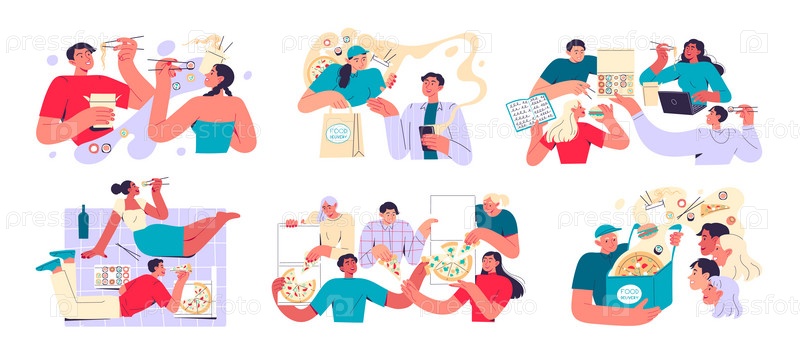 Люди едят, друзья заказывают и покупают еду, едят вместе