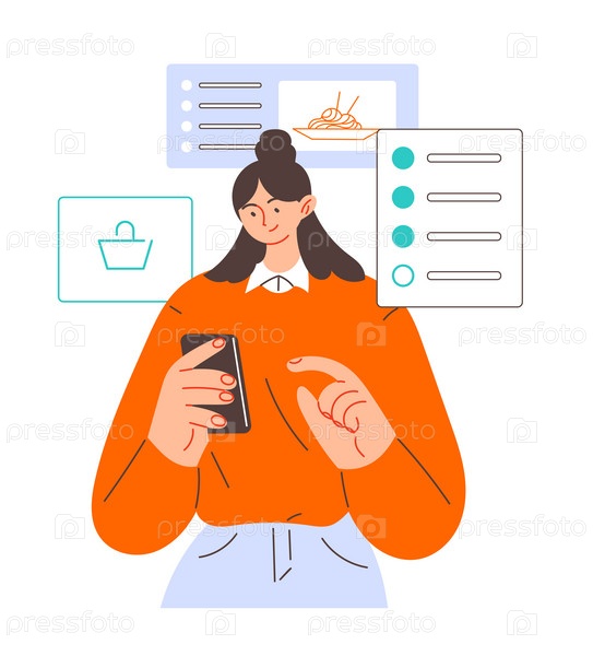 Заказ еды онлайн, женщина выбирает еду и заказывает доставку
