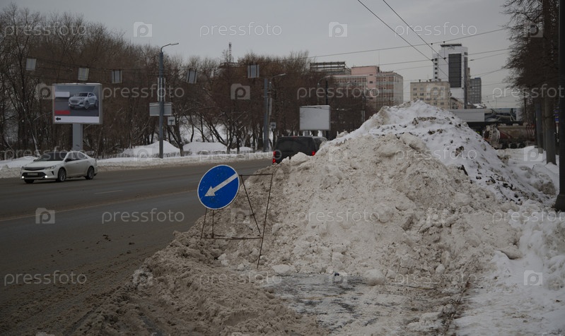 Уличный пейзаж. Дорожный знак и сугробы на городской улице. Снегопад, коммунальные службы и уборка снега