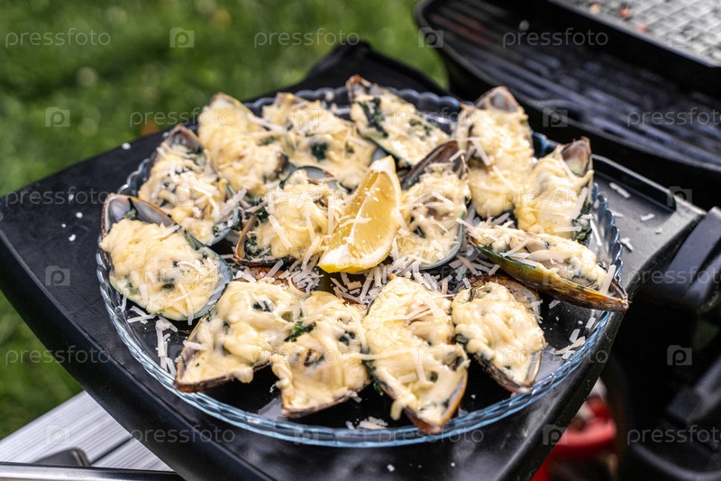 Устрицы с сыром приготовленные на гриле, крупным планом