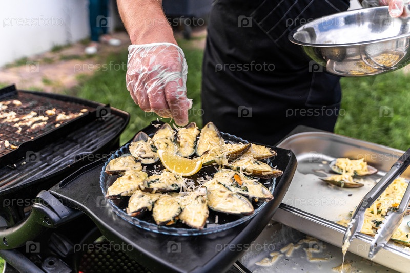Повар готовит устрицы с сыром на гриле