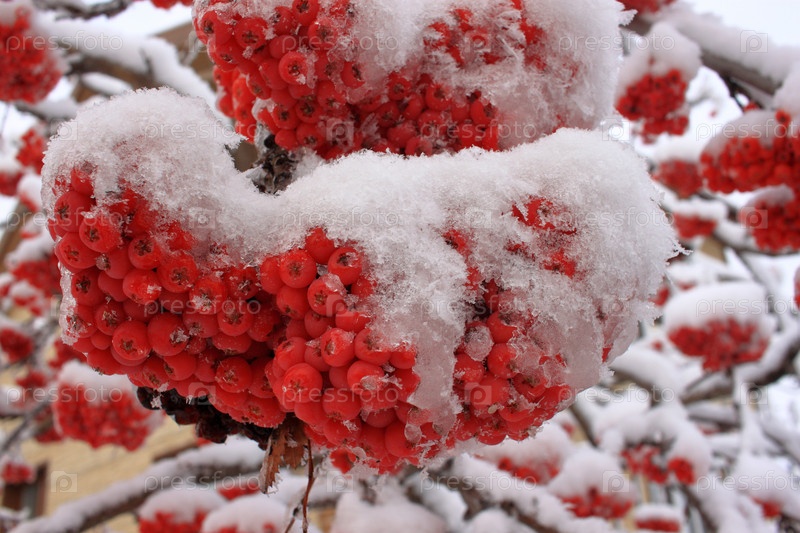 Ягоды рябины на ветке покрытые снегом