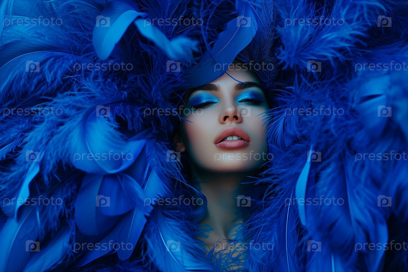 Модный портрет красивой девушки в окружении голубых перьев