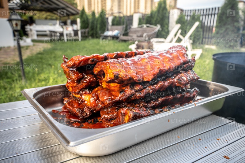 Ребрышки свиные, копченые в соусе барбекю, на подносе