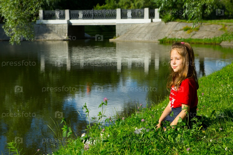 Девочка сидит на берегу пруда в парке