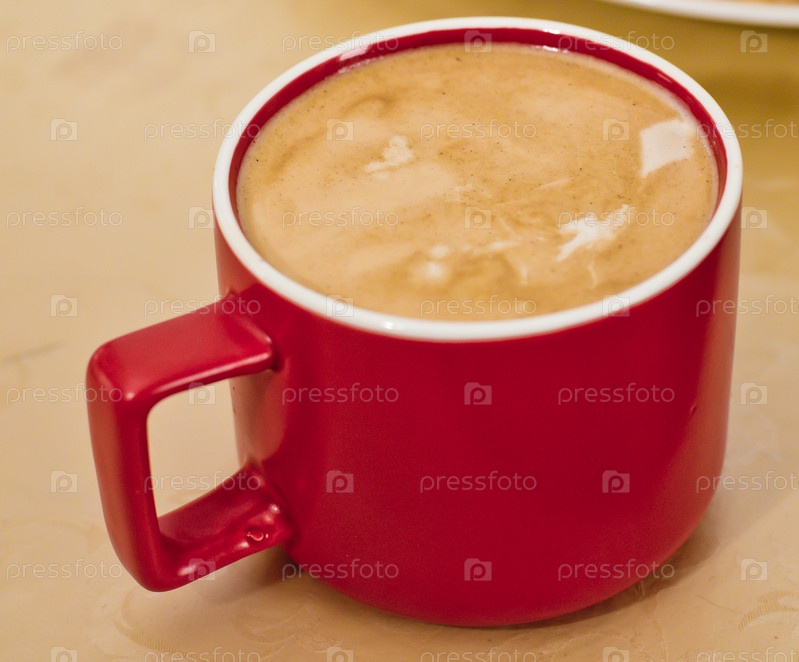 Капучино в красной кружке крупным планом на столе