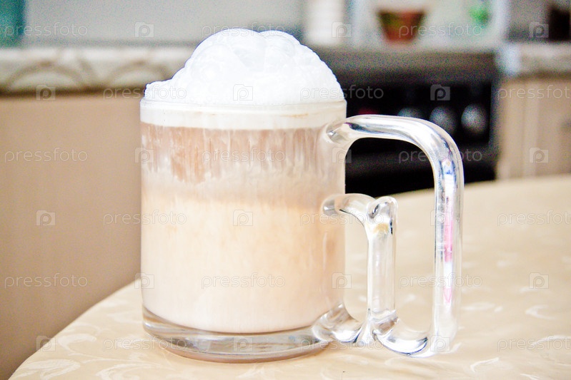 Капучино в стеклянном бокале крупным планом на столе. Фото с шумом