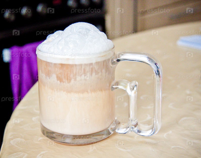 Капучино в стеклянном бокале крупным планом на столе. Фото с шумом