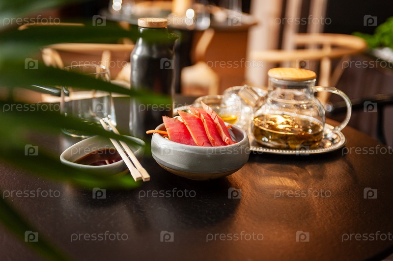 Сашими из тунца на тарелке на столе в суши-баре