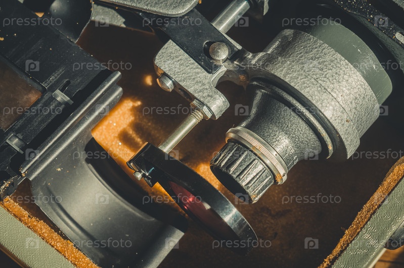 Старый советский фотоувеличитель. Набор для проявки пленочной фотографии. Пыль на деталях, горизонтальная композиция, винтаж