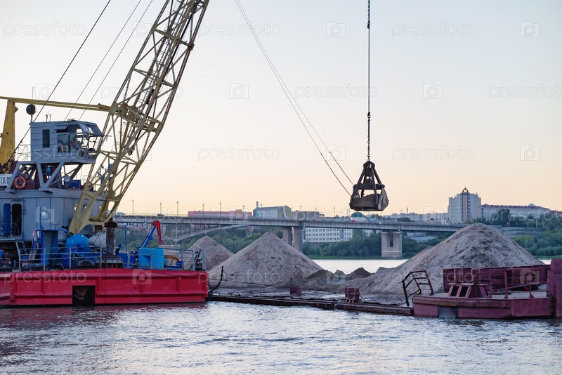 Речной порт. Портовые краны на берегу реки. Добыча и транспортировка песка и других грузов. Набережная речного порта, баржа у причала